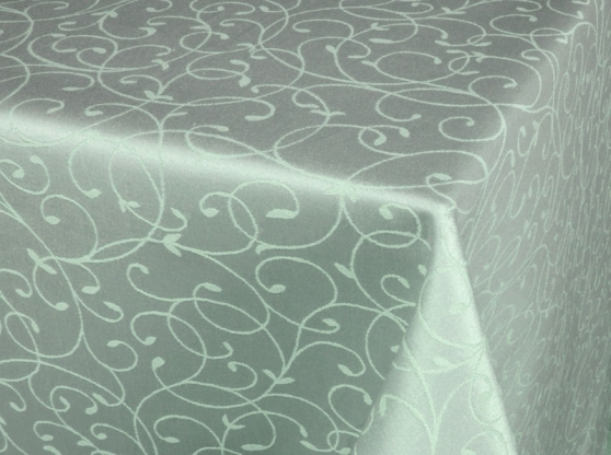 Ткань для скатерти с пропиткой типа "Тефлон" с тонким жаккардовым узором бежевого цвета на серебристом фоне. Двухцветное крашение, удобная ширина для раскроя овальных и круглых скатертей. В одном рулоне "Ричард" - 25 м ткани.